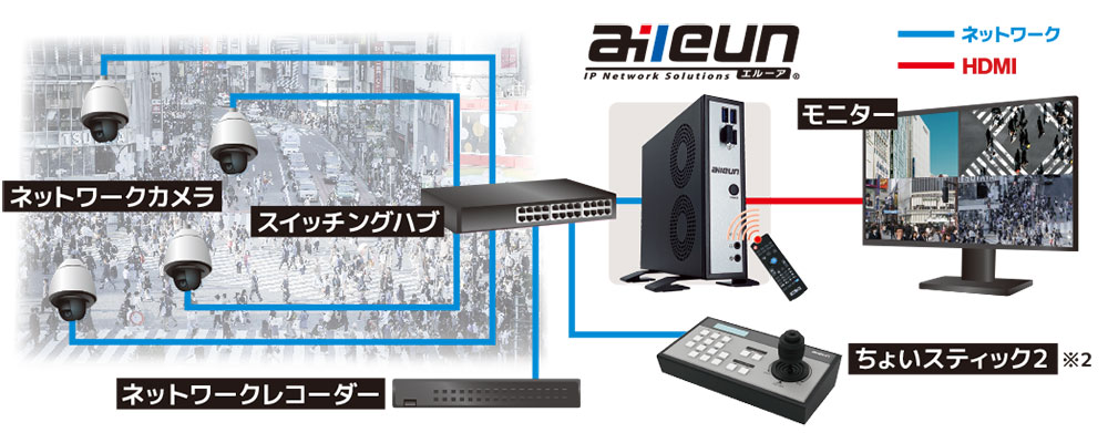 システム面では、i–PRO、キヤノン、アクシス、TOAなどの主要メーカーに加え、ONVIF規格に対応。異なるメーカーのカメラを混在させた運用も容易に行える。外付けUSB HDD(※推奨品あり)を接続すれば簡易レコーダーとしても機能し、付属のワイヤレスリモコンでテレビのように直感的に操作できる。さらに同社製の「ちょいスティック2」を加えることにより、PTZカメラの遠隔操作に加え、エルーアとの連動により画面の切替機能にも対応。