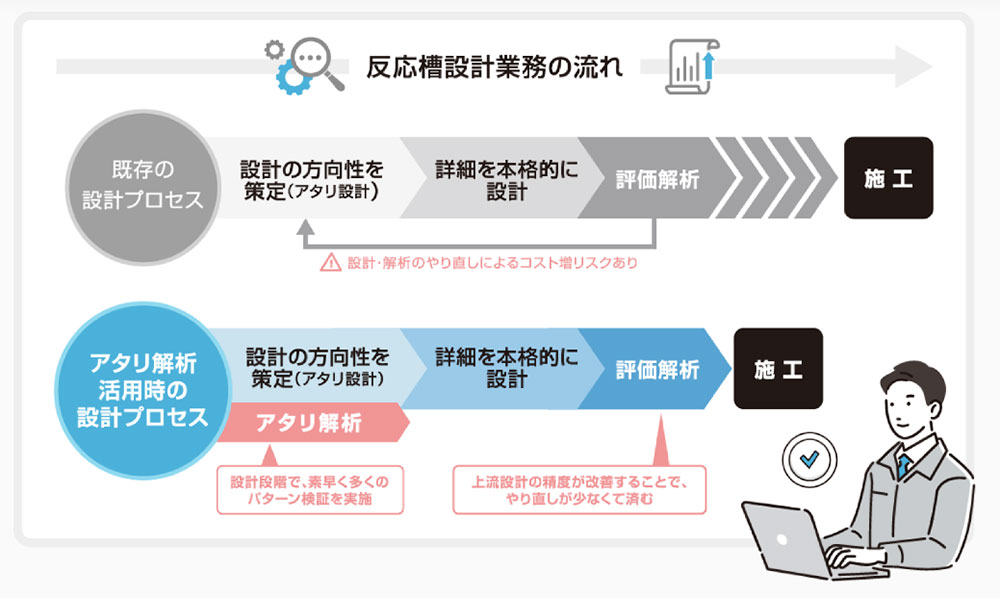 水処理施設の反応槽における設計において、解析の専門知識を持たない設計者でも独力で簡易的なシミュレーションを行えるWebサービスです。設計初期の段階から「アタリ解析」を活用することで、工程全体の効率化とコスト削減を図ることができ、さらにサービス内に蓄積された解析データを活用することで、設計技術の継続的な向上にも貢献します。