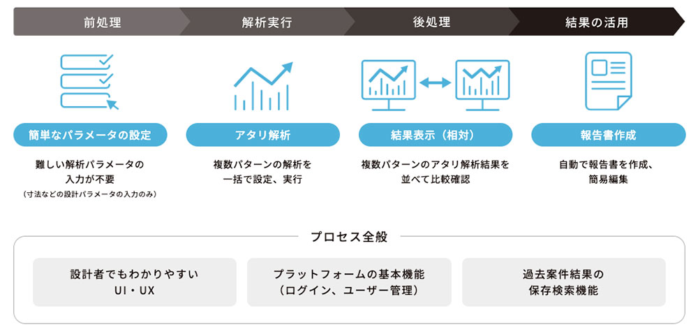 専門知識不要で設計パラメーターを入力するだけの簡単操作。快適な使い心地と高いユーザビリティによるストレスフリーな解析環境を提供。設計業務における属人化の解消や、それに伴う品質の安定化・向上に貢献。
